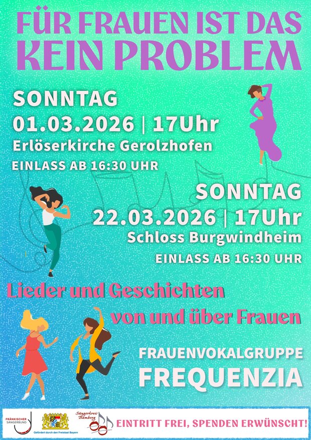 Die Frauenvokalgruppe Frequenzia aus Burgebrach lädt ein zum Konzertabend mit Liedern und Geschichten von und über Frauen. Die Zuhörerinnen und Zuhörer erwartet ein facettenreiches Programm – nicht nur für Frauen.