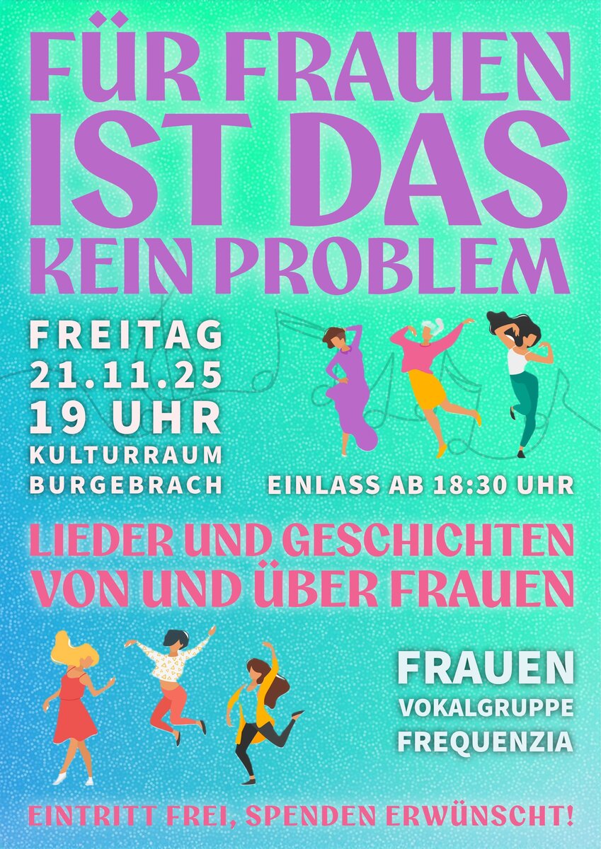 Die Frauenvokalgruppe Frequenzia aus Burgebrach lädt ein zum Konzertabend am Freitag, den 21.11.2025, um 19 Uhr im Kulturraum Burgebrach mit Liedern und Geschichten von und über Frauen. Die Zuhörerinnen und Zuhörer erwartet ein facettenreiches Programm – nicht nur für Frauen.